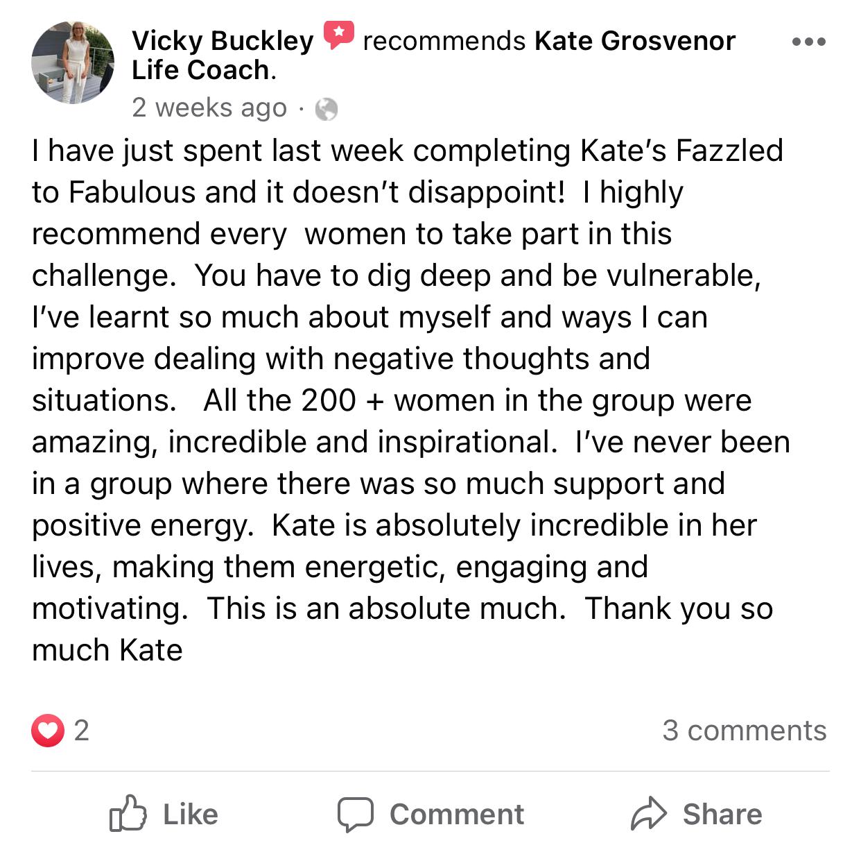 Kate is a force of nature and one of life’s truly inspirational people – I’d never had life coaching before, I guess I always thought it was frivolous and something only celebrities did! But after attending an event which Kate was hosting I realised this is for everyone and totally accessible … after a course of 1:1 coaching with Kate I’m feeling soooo much better!!! Worth every single penny – Even my 15yr old has noticed the change – stronger, positive, calmer, active, full of life (and water!) energised and confident.